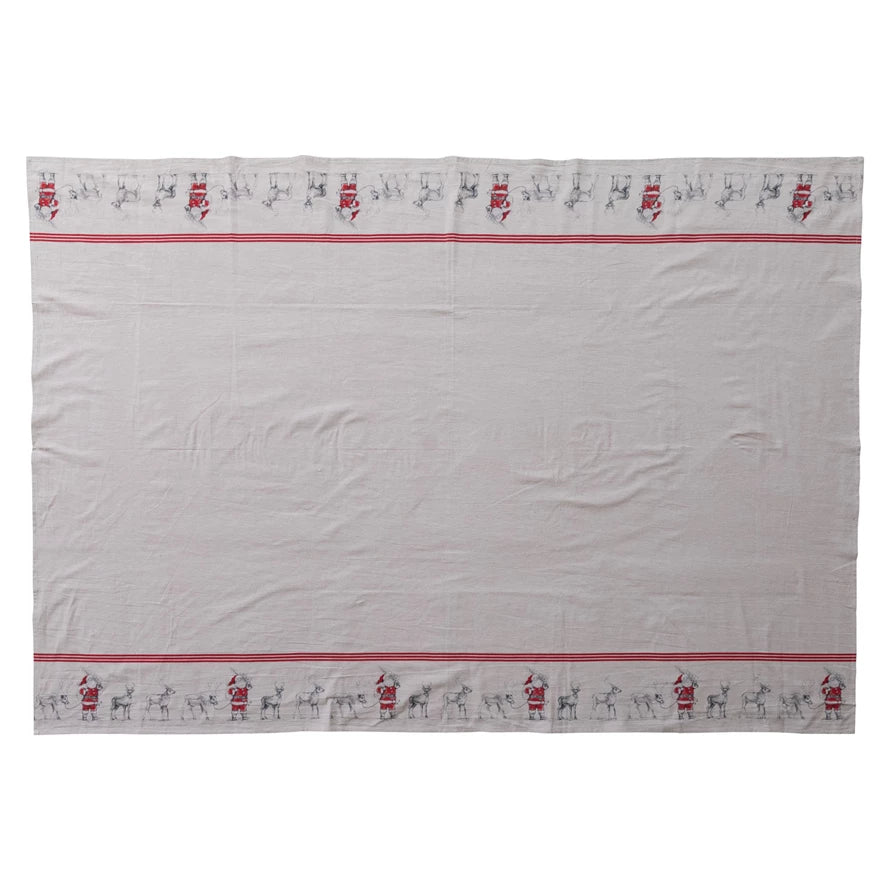 Table Cloth with Santa Leading Reindeer Image & Stripes, Natural