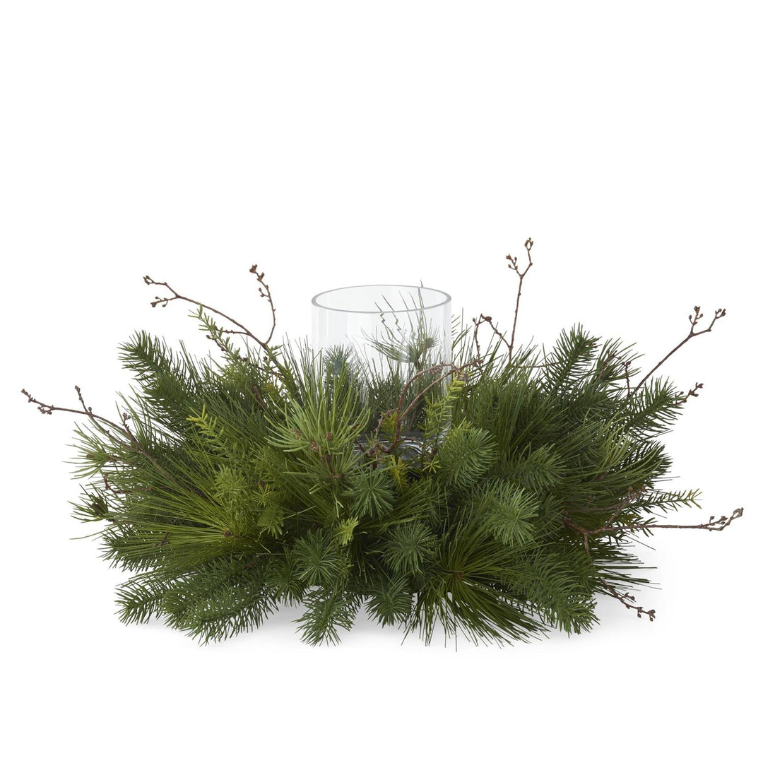 21 Inch Mixed Pine & Twig Candle Ring w/ Glass Hurricane
